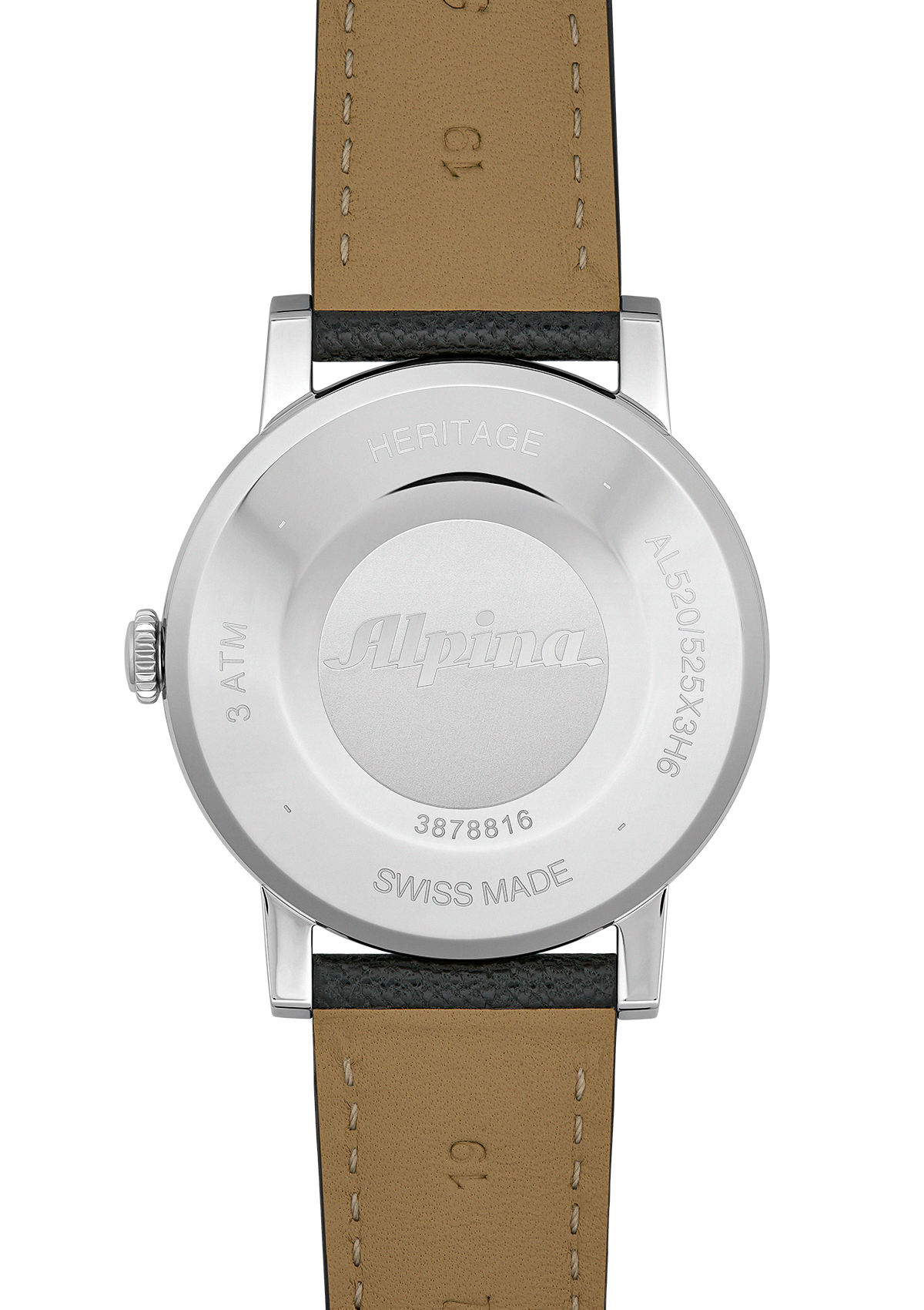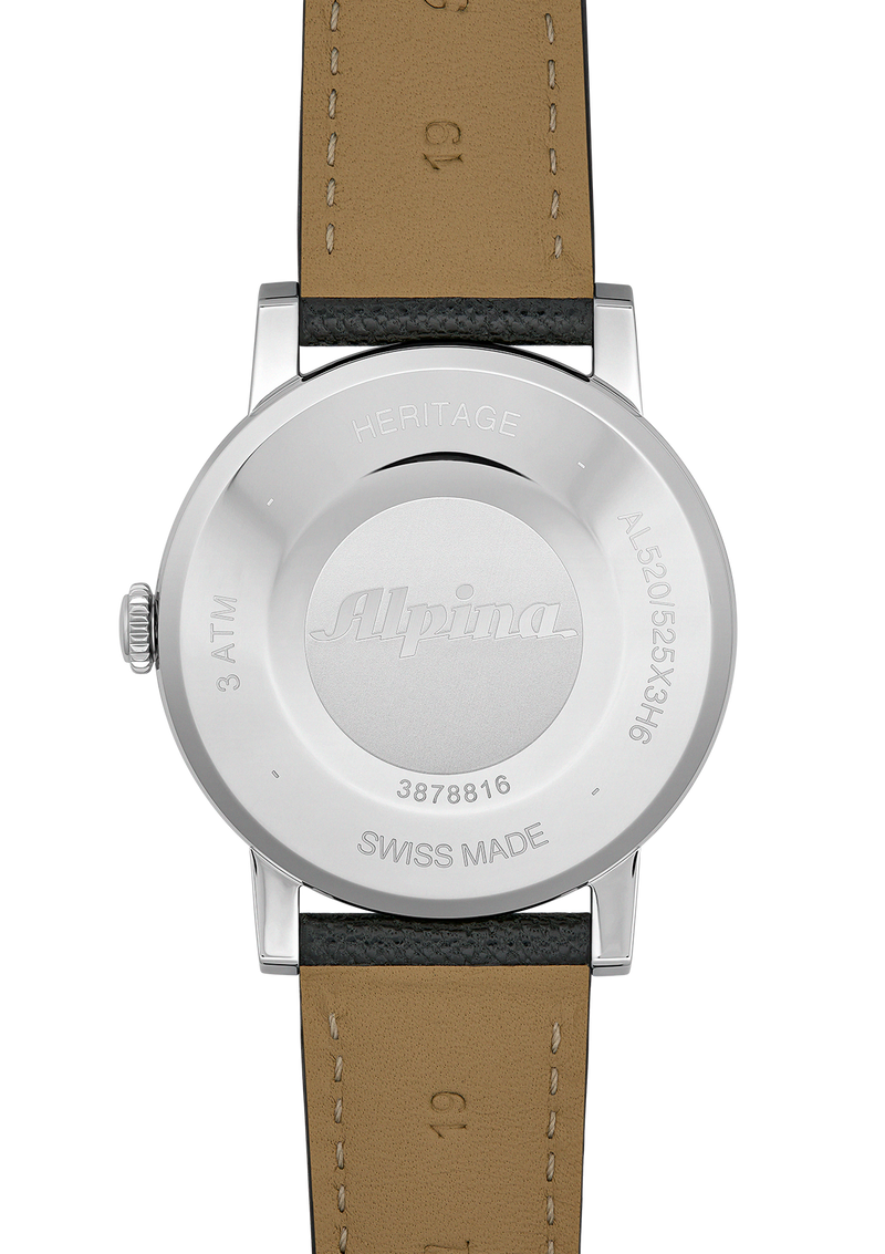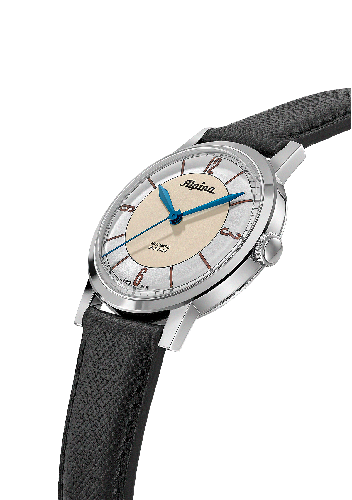 The Heritage Automatic is available in two versions: beige dial with 12 Arabic numerals, or beige and satin gray dial with bronze indexes. Both models retain the aesthetic codes of the Belle Époque, with a "railway" minute track and the Alpina logo of yesteryear.