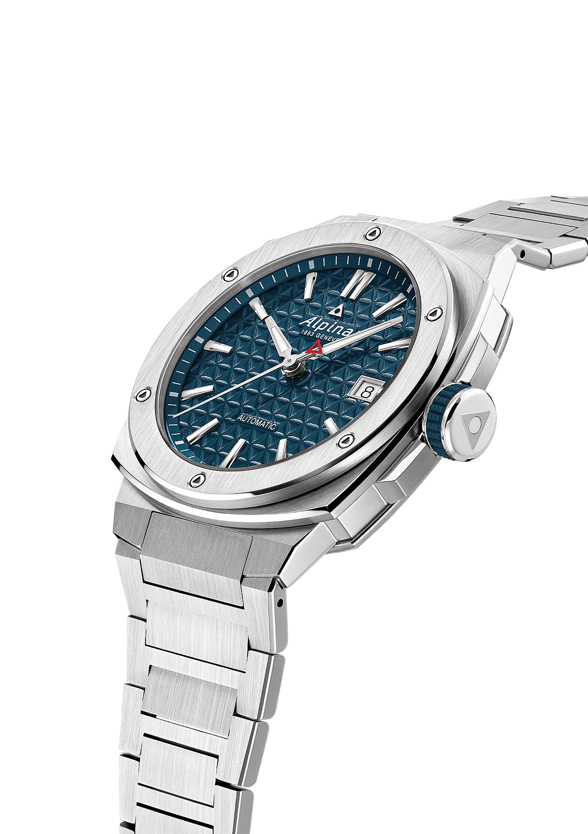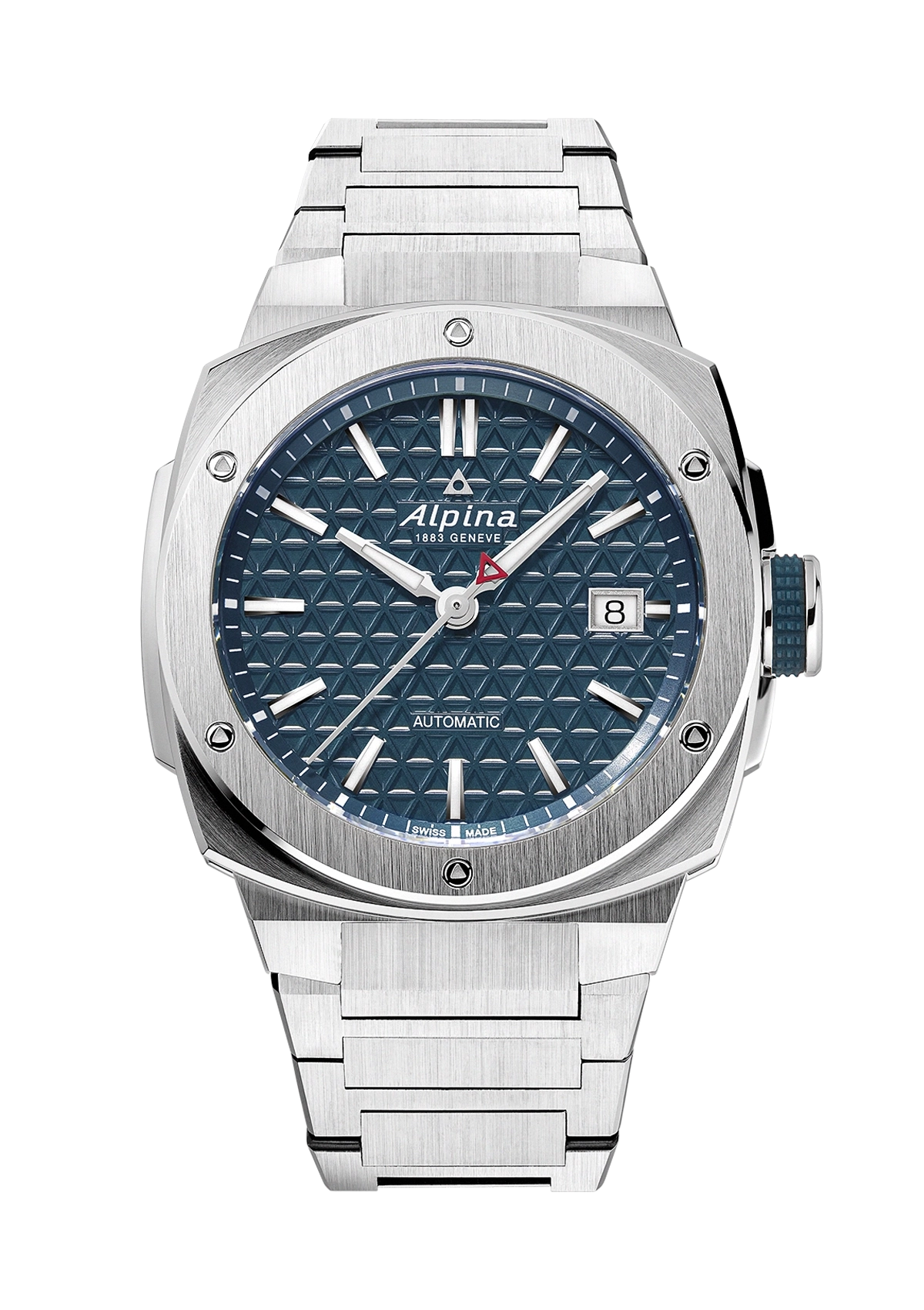 Alpina's signature ‘Extreme’ case is distinguished by its unique shape, both square and round. Robust and water-resistant, it is suitable for all activities, from the most sporty to the most formal.
