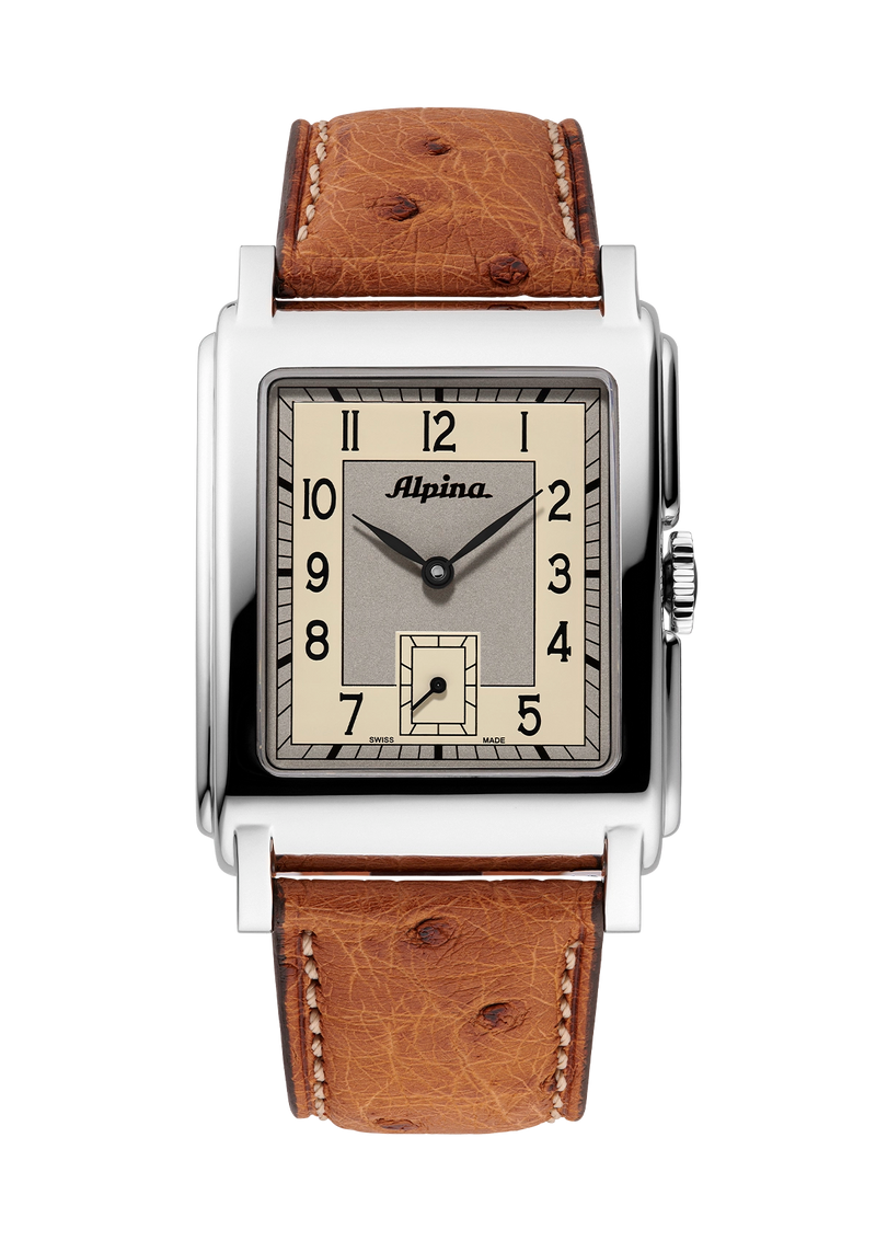 The Alpiner Heritage Carrée Automatic 140 Years is distinguished by its vintage aesthetic. The black hands and small seconds at 6 o'clock are reminiscent of traditional pocket watches. The light brown ostrich leather strap completes its refined look. A watchmaking tribute to timeless elegance.
