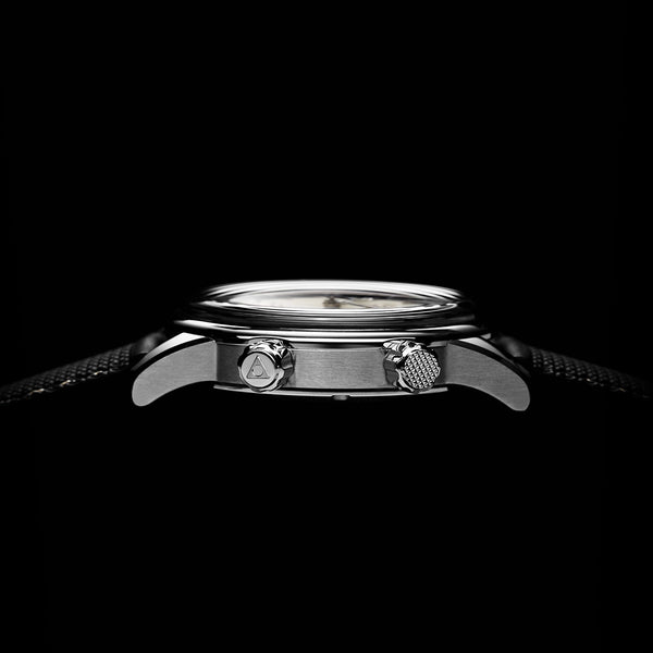 This watch is designed for water sports enthusiasts. It displays the hours, minutes, seconds and date, and is powered by a reliable and precise automatic movement. The scratch-resistant ‘box’ sapphire crystal and screw-down crown provide maximum protection. A water-resistant black leather strap completes the look.