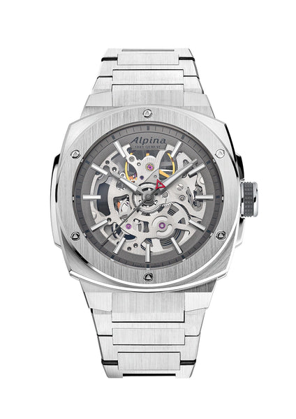 Alpina surprises with a skeleton version of its emblematic Alpiner Extreme. The dial disappears in favour of an unobstructed view of the Swiss Made automatic movement, housed in a redesigned, more compact cushion case. This sporty, elegant watch asserts its technical and watchmaking style.