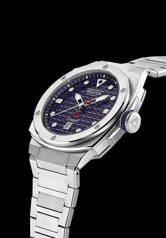 The Seastrong Diver Extreme Automatic, limited edition of 150 pieces, celebrates the Arkea Ultim Challenge. Its 41x42.50 mm stainless steel case, water-resistant to 200m, houses the AL-525 automatic caliber. The silver dial, decorated with the Arkea logo, and the blue bezel recall the marine world.