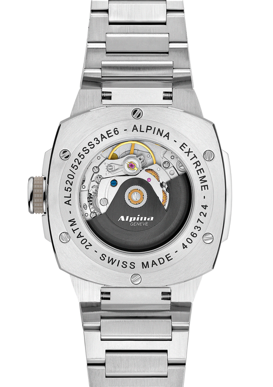 Le boîtier "Extreme", signature d'Alpina, se distingue par sa forme unique, à la fois carrée et ronde. Robuste et étanche, il s'adapte à toutes les activités, des plus sportives aux plus formelles.
