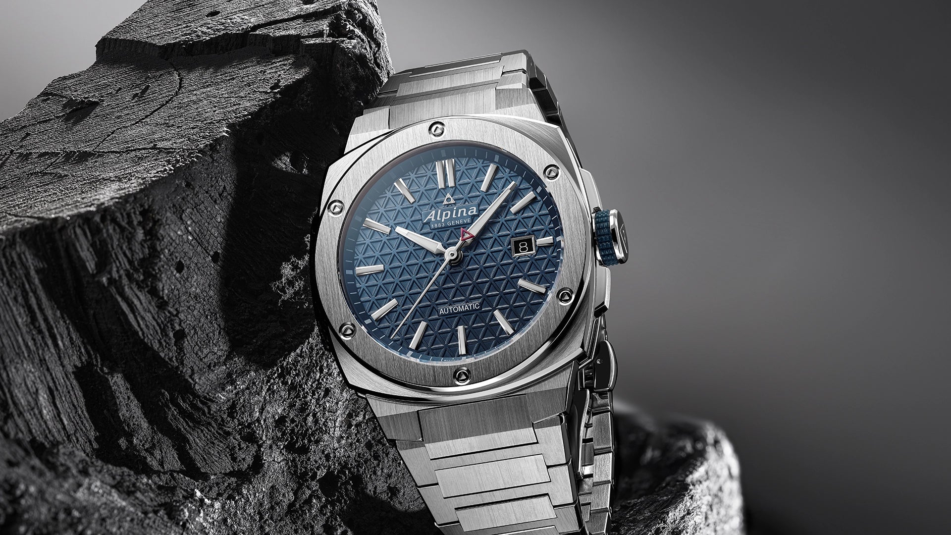 L'Alpiner Extreme Automatic arbore un boîtier robuste en acier inoxydable de 41 x 42,5 mm, étanche à 200 mètres. Son cadran bleu profond, orné du motif triangulaire Alpina, affiche les heures, minutes, secondes et la date.