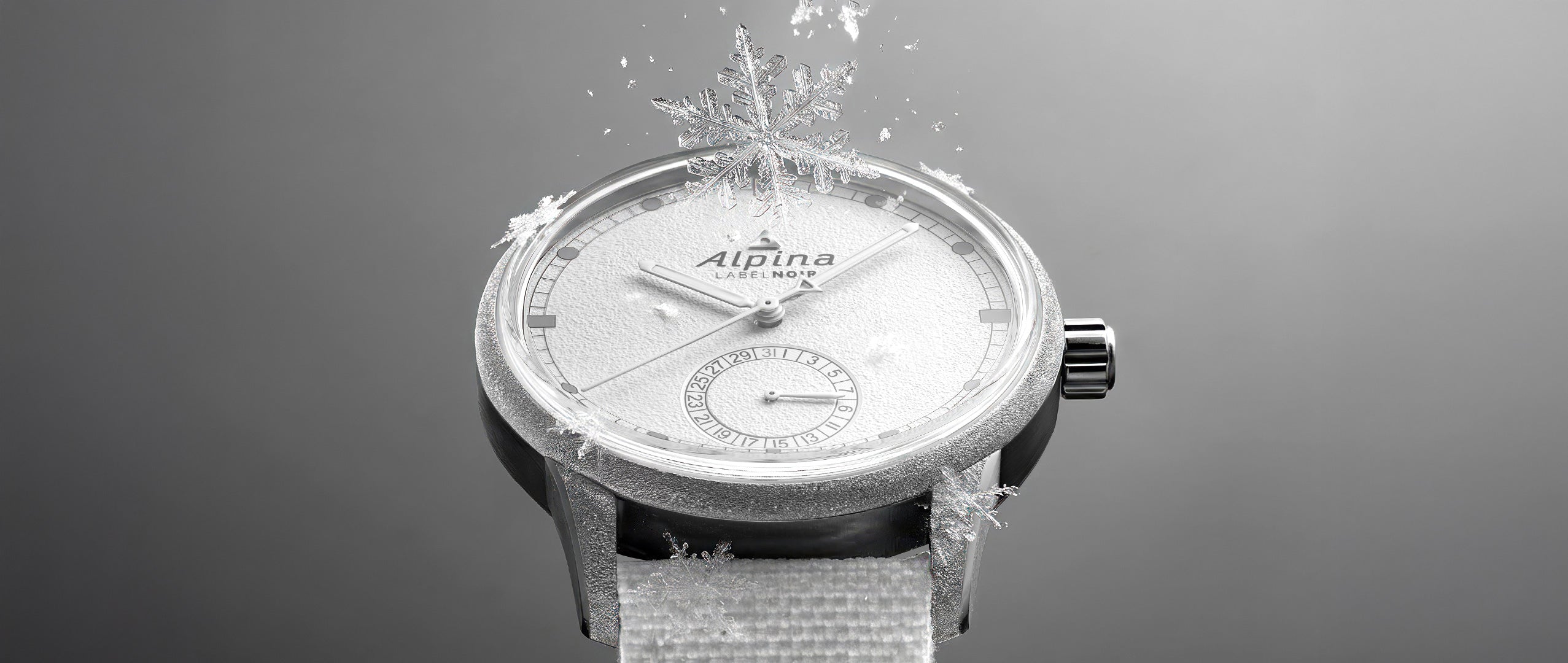 The watch's immaculate white dial is distinguished by its finely grained frosted texture, against which the grey hour markers and the applied Alpina logo stand out. To ensure perfect legibility, the hour and minute hands are lacquered in smooth white and filled with blue luminescent treatment, offering an elegant monochrome contrast. A window at 6 o'clock displays the date with a hand, a visual signature of the manufacture's high-autonomy calibres. The whole is mounted on a white technical nylon strap, both lightweight and resistant, perfectly suited to the alpine world.