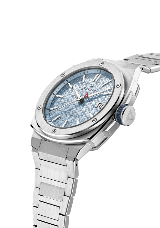 Alpina's signature ‘Extreme’ case is distinguished by its unique shape, both square and round. Robust and water-resistant, it is suitable for all activities, from the most sporty to the most formal.