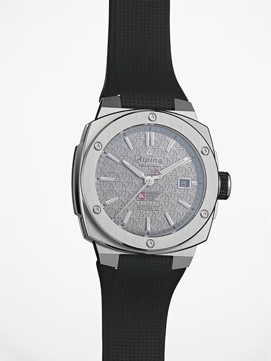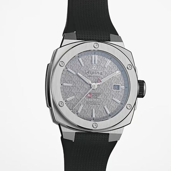 The Alpiner Extreme Automatic Freeride World Tour Special Edition marks the ninth year of the partnership between Alpina and the Freeride World Tour (FWT). The two entities share a common spirit, characterized by the love of the mountain, a desire to push limits, and a sense of audacity. This special edition is a representation of this spirit of commitment, precision, and daring, shared by the riders who brave the elements. For the first time, the gray dial features the iconic FWT logo – a stylized line descending a mountain – instantly symbolizing freeriding and the summits. The screwed-down case back is also engraved with an exclusive, non-limited Freeride World Tour motif, dedicated to those who share this spirit of freedom and extremes.