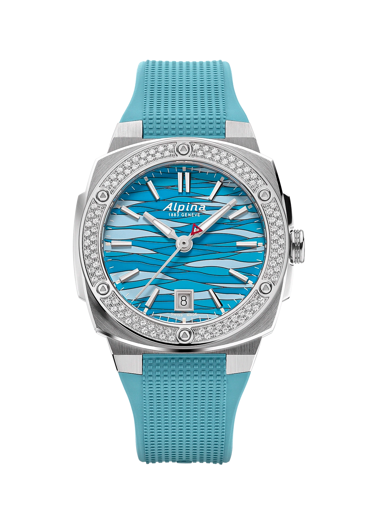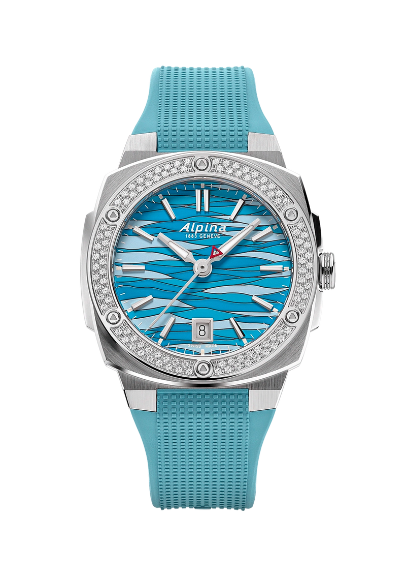 The glacier-blue rubber strap, matching the dial, ensures optimum comfort and closes with a push-button folding clasp. The silvered luminescent hour-markers and polished luminescent hands ensure perfect legibility. The seconds hand features Alpina's emblematic red triangle.